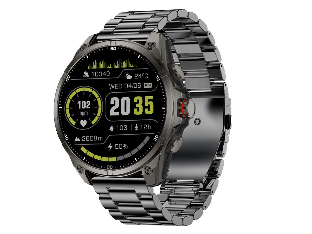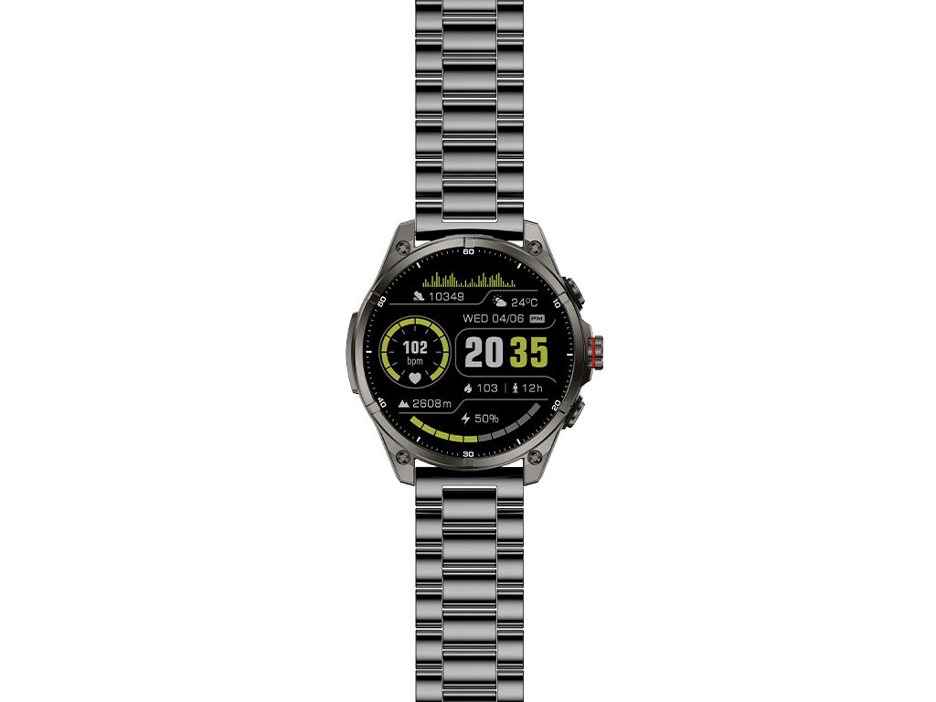Carneo GTR eXpedition s kovovým tělem silným jen 11 mm, odolným kovovým řemínkem a 1,43” SUPER AMOLED HD displejem (466 × 466 px) spojuje elegantní design s robustní konstrukcí. Vodotěsnost 5ATM znamená, že je vhodný pro plavání, déšť i ponoření do hloubky až 50 metrů, zatímco sklo Gorilla Glass chrání displej před poškrábáním. Robustní kovové tělo se zvýšenou odolností zvládne nástrahy terénu – od prachu a bláta, přes mráz a písek, až po nečekané nárazy.