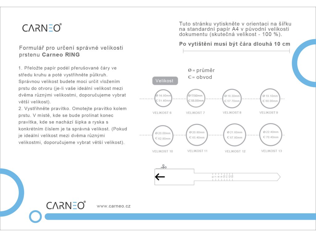 Měřítko pro zjištění velikosti prstu Vážení zákazníci, abychom vám zajistili správnou velikost vašeho prstenu Carneo, prosíme vás, abyste si před objednáním stáhli a použili naše měřítko pro zjištění velikosti prstu. Přesné zjištění velikosti prstu vám zaručí pohodlné a bezpečné nošení prstenu, který bude dokonale sedět. Děkujeme za pochopení a spolupráci. ZDE>